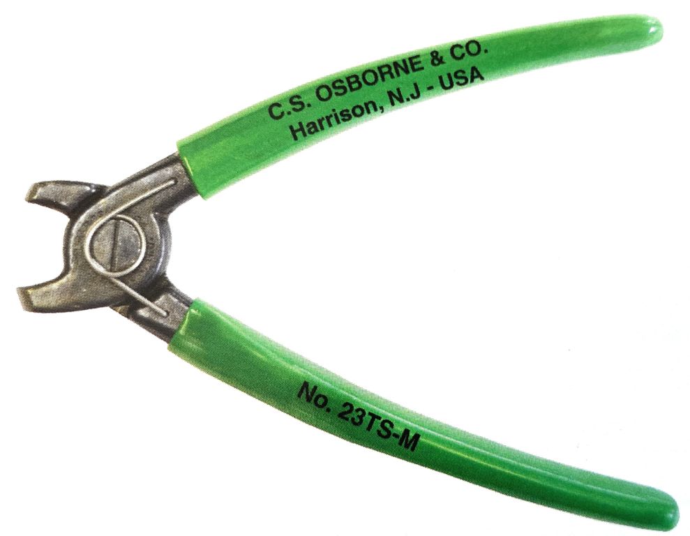 Pince munie d'un ressort pour ouverture automatique, l'agrafe est maintenue par pression sur les manches (ressort seul livrable sur demande)